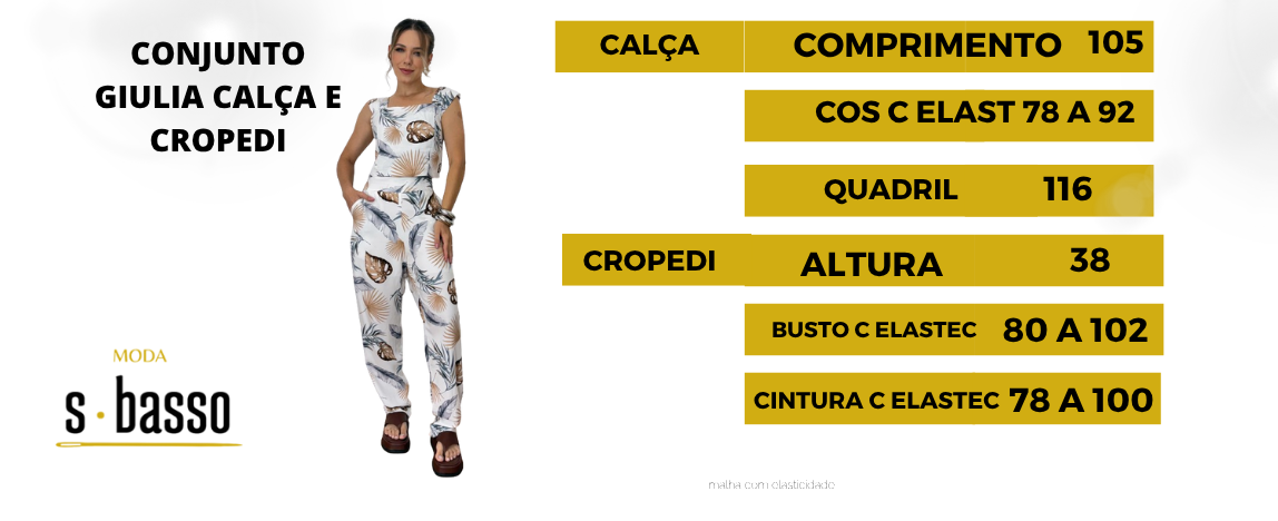 O cropped valoriza o visual com um toque moderno, alças largas, elastec na costa deixando a frente ajustada e confortavel enquanto a calça proporciona elegância e praticidade com sua barra estilo cenoura, bolsos e ziper lateral, elatico no cós de tras. Ideal para diversas ocasiões, do casual ao mais elaborado.