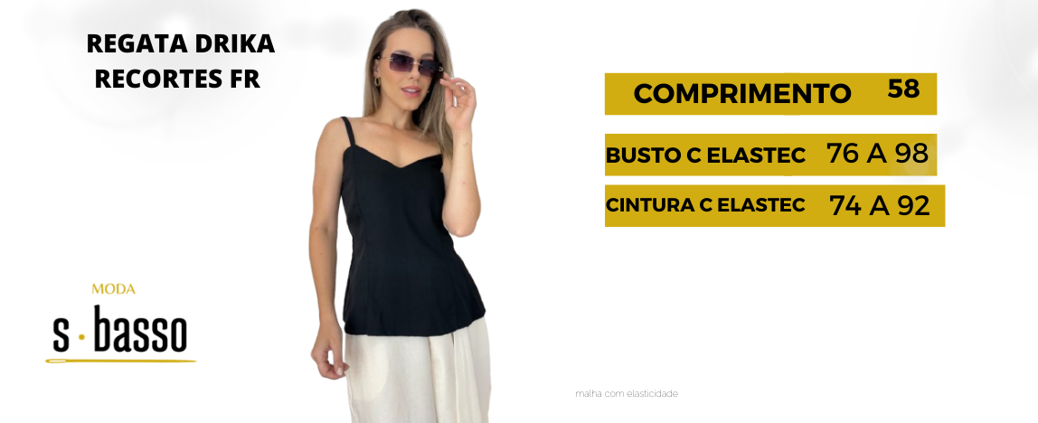 Regata basica com recortes de costura na frente, aquela peça que cabe em qualquer look, ela tem alças finas com regulador e elastec na costa p/ deixar a frente ajustada e muito confortavel
